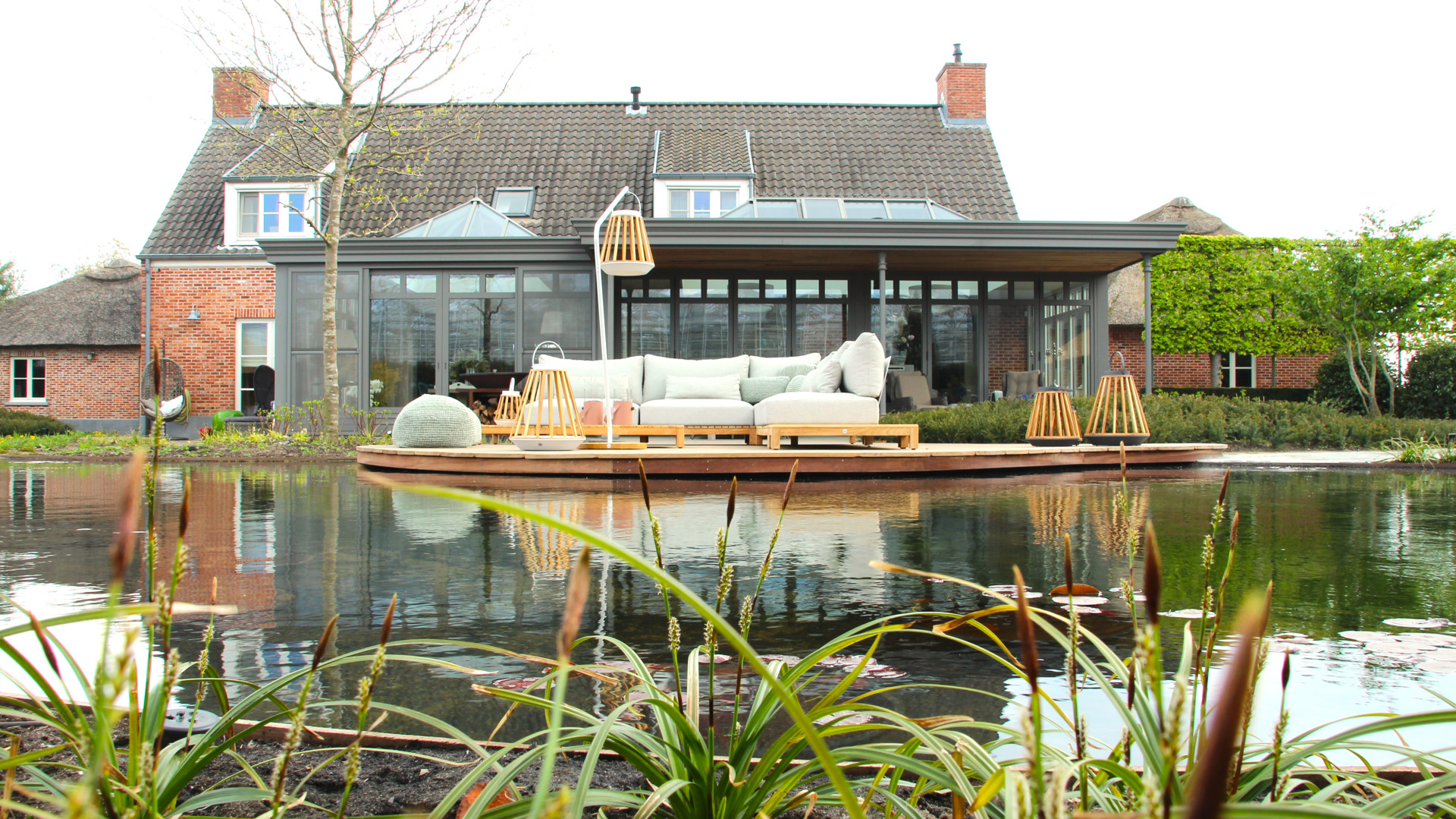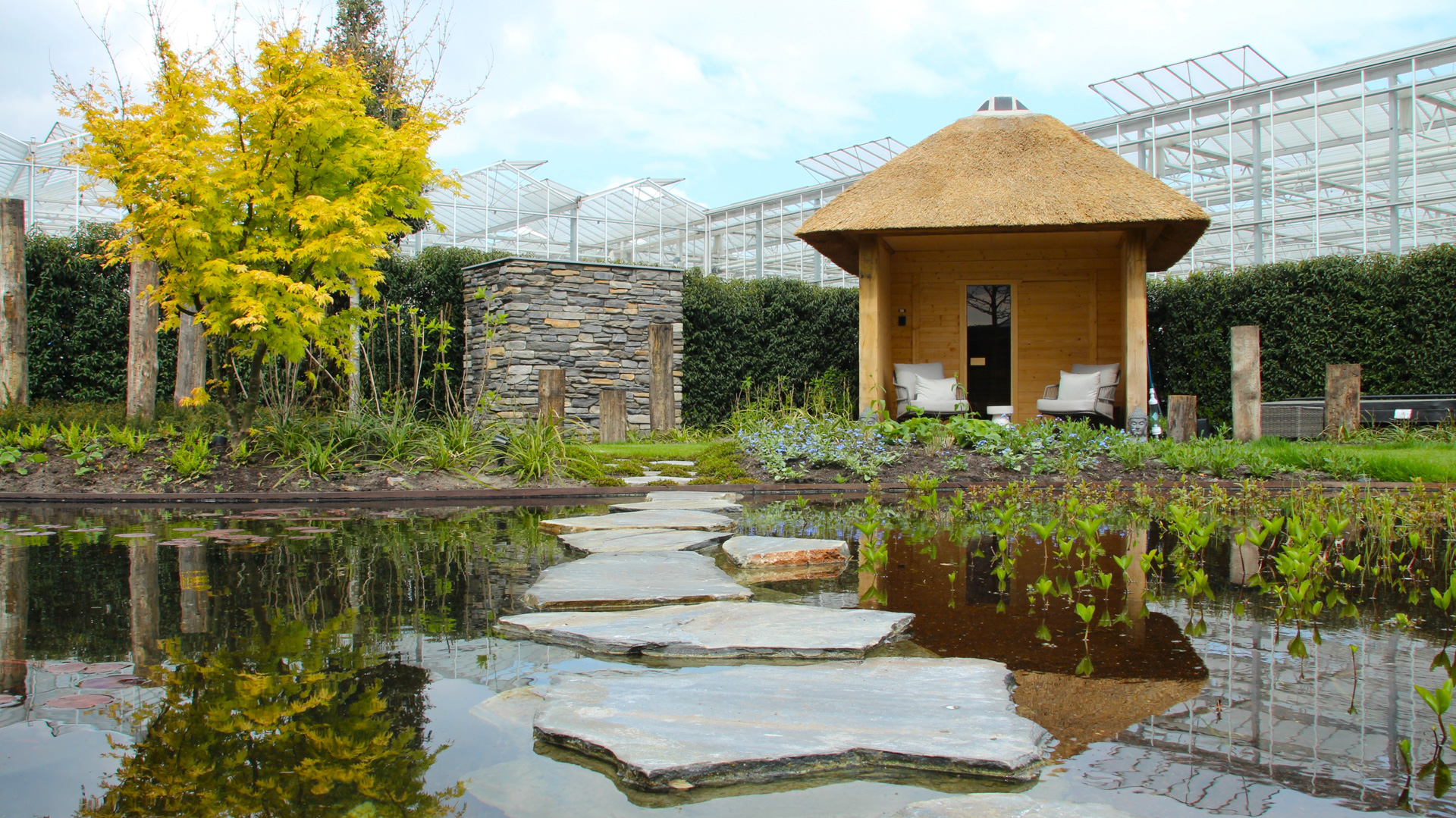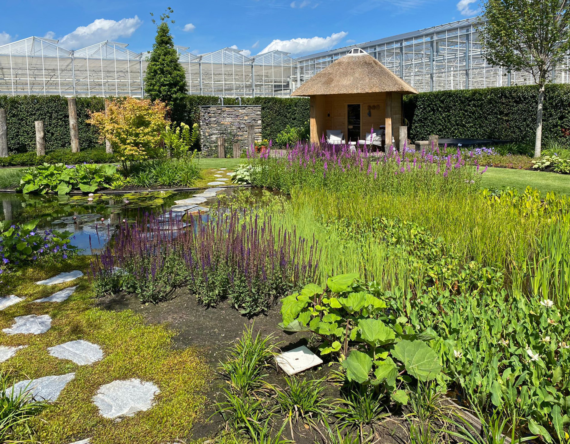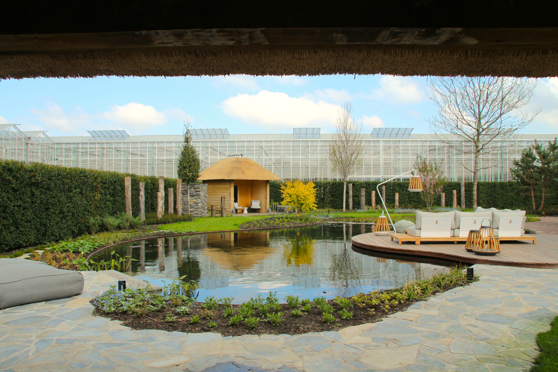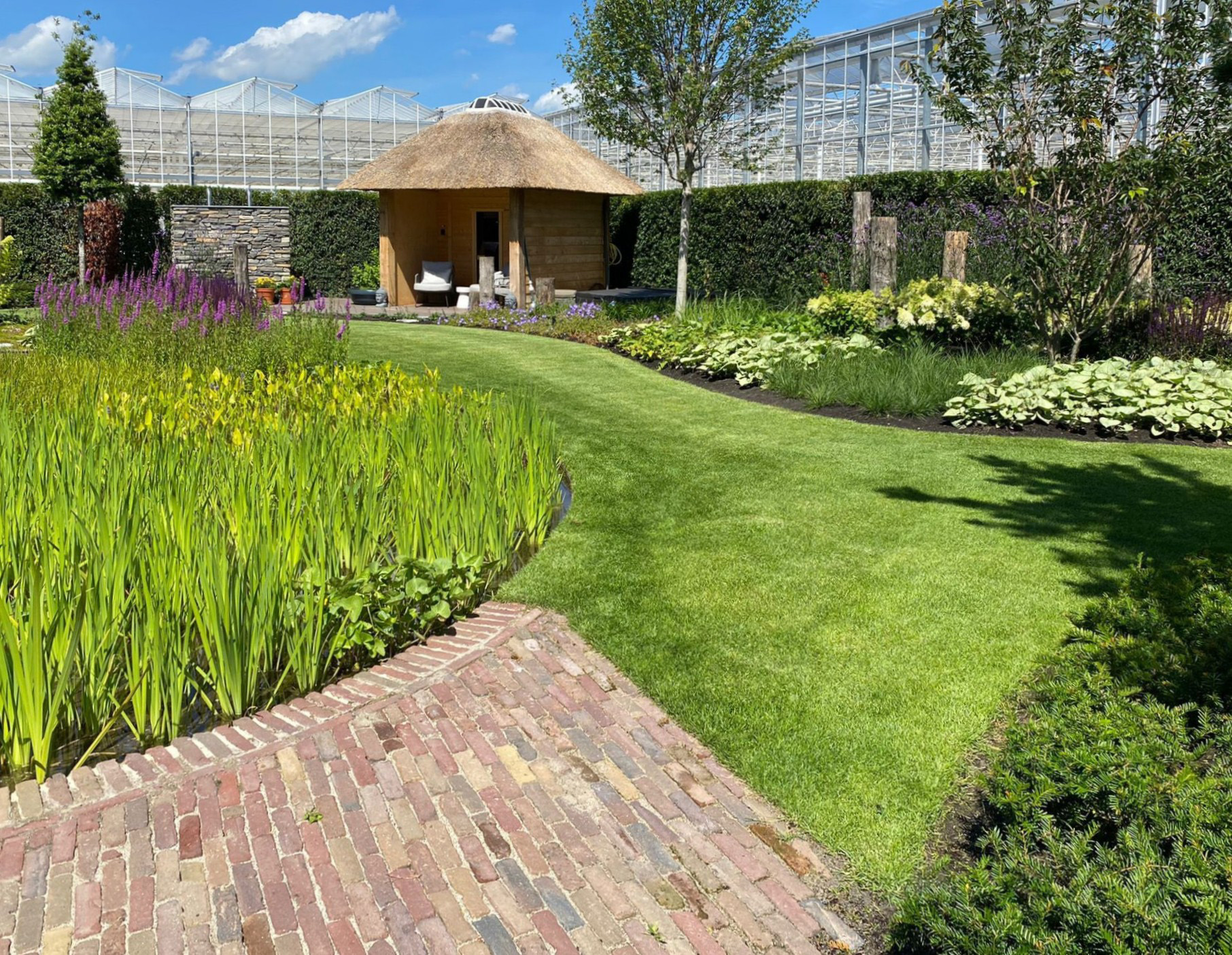 Voor ultieme ontspanning is een compleet wellness-gedeelte met een luxe sauna gerealiseerd, ondergebracht bij een imposante eikenhouten veranda met rieten kap die de tuin een landelijk en tijdloos karakter geeft.