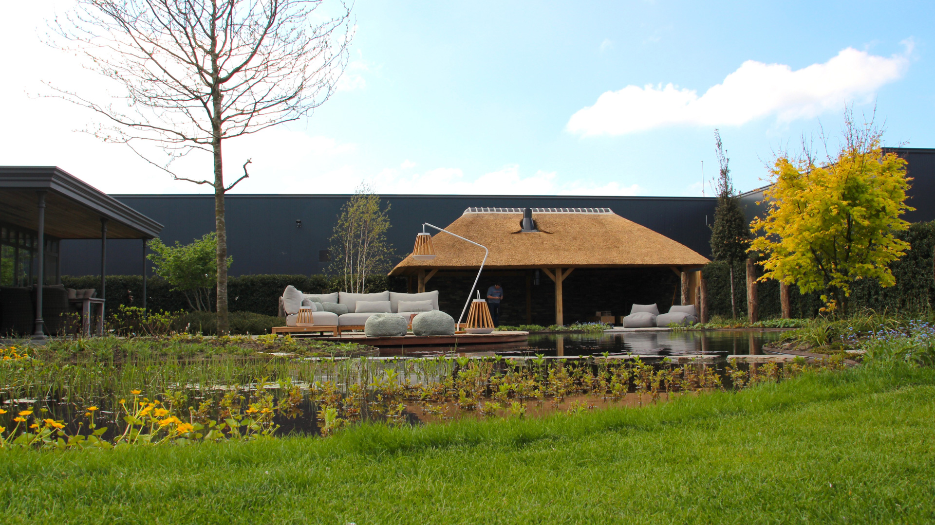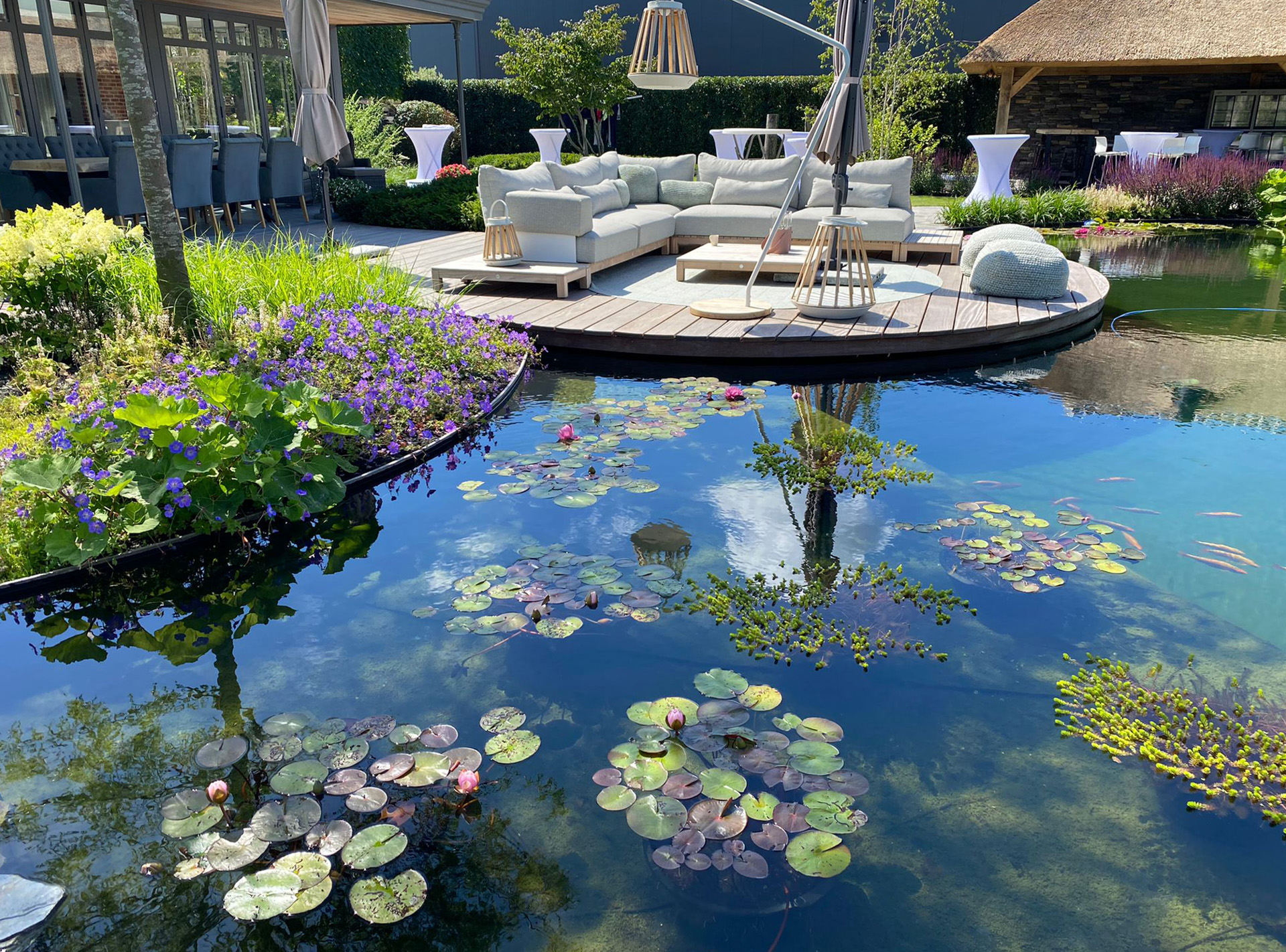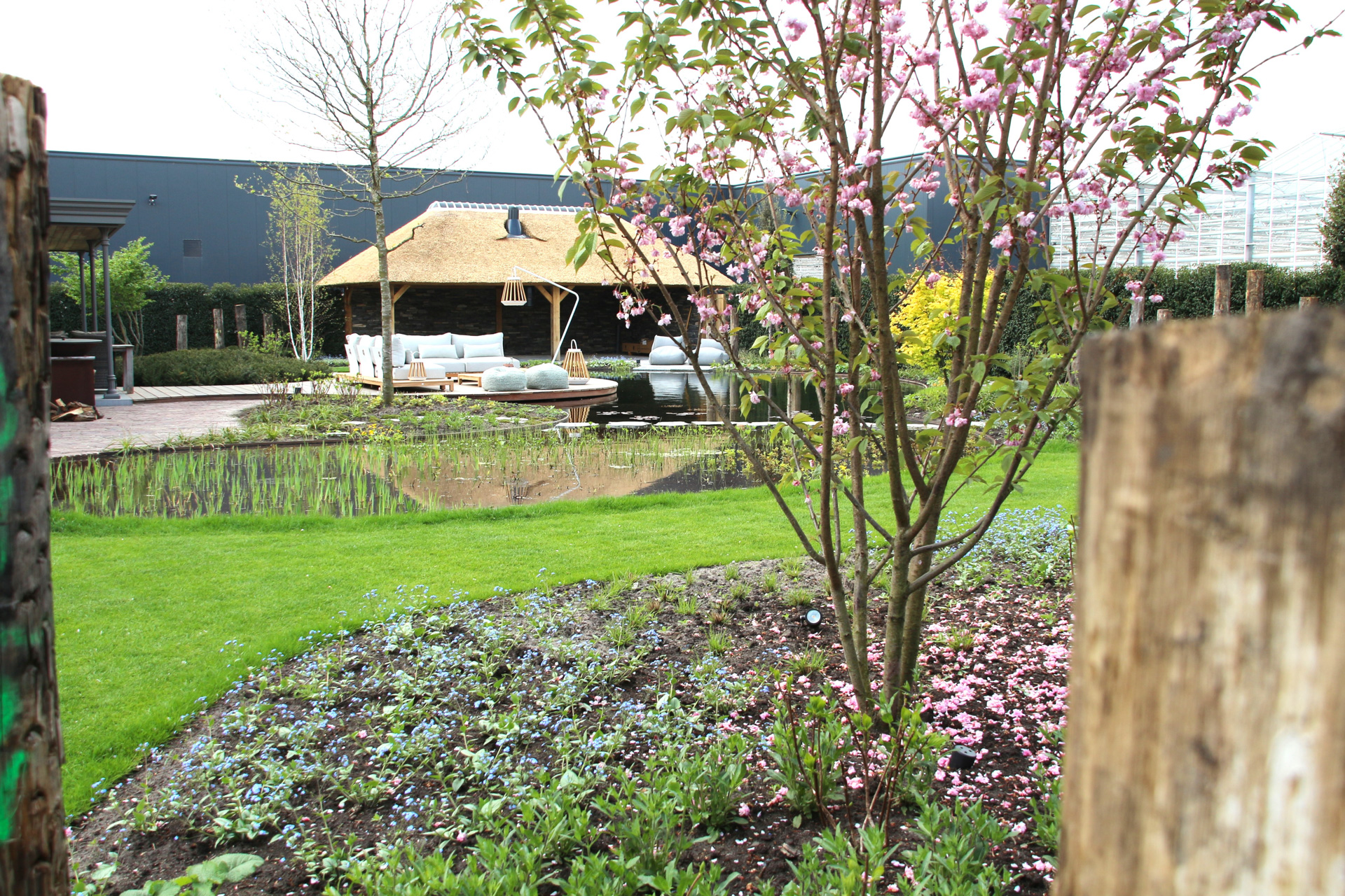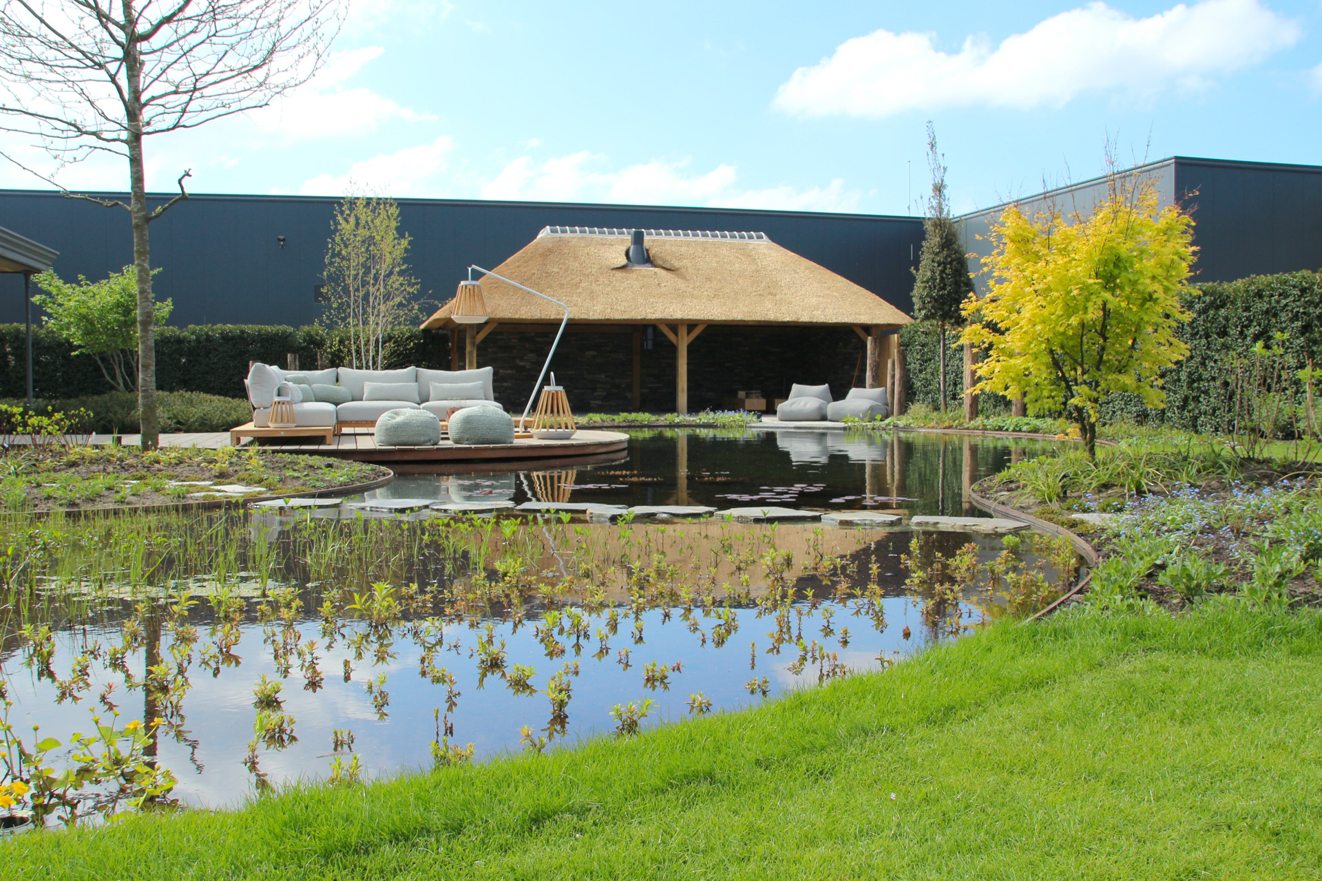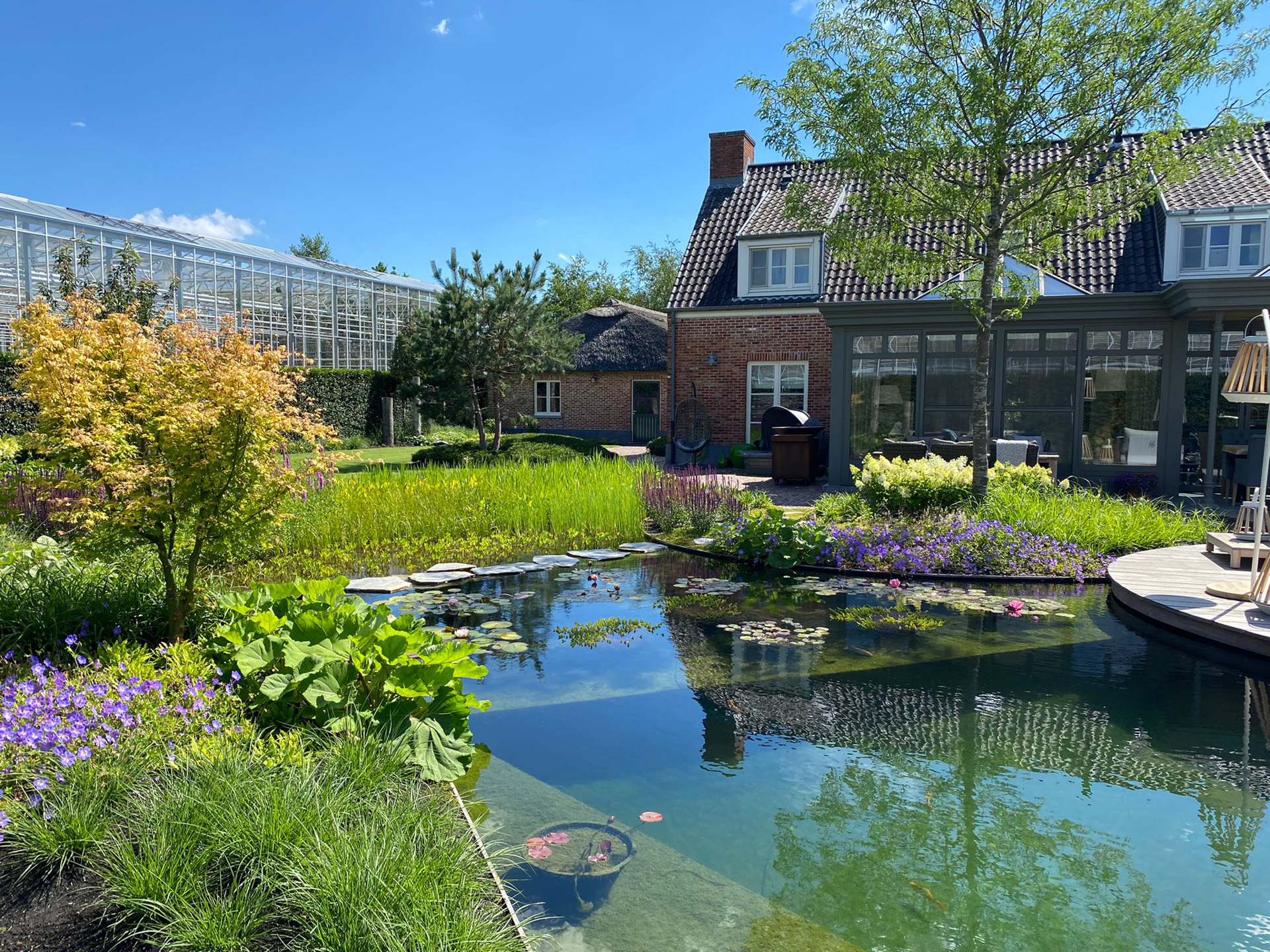 Voor ultieme ontspanning is een compleet wellness-gedeelte met een luxe sauna gerealiseerd, ondergebracht bij een imposante eikenhouten veranda met rieten kap die de tuin een landelijk en tijdloos karakter geeft.
