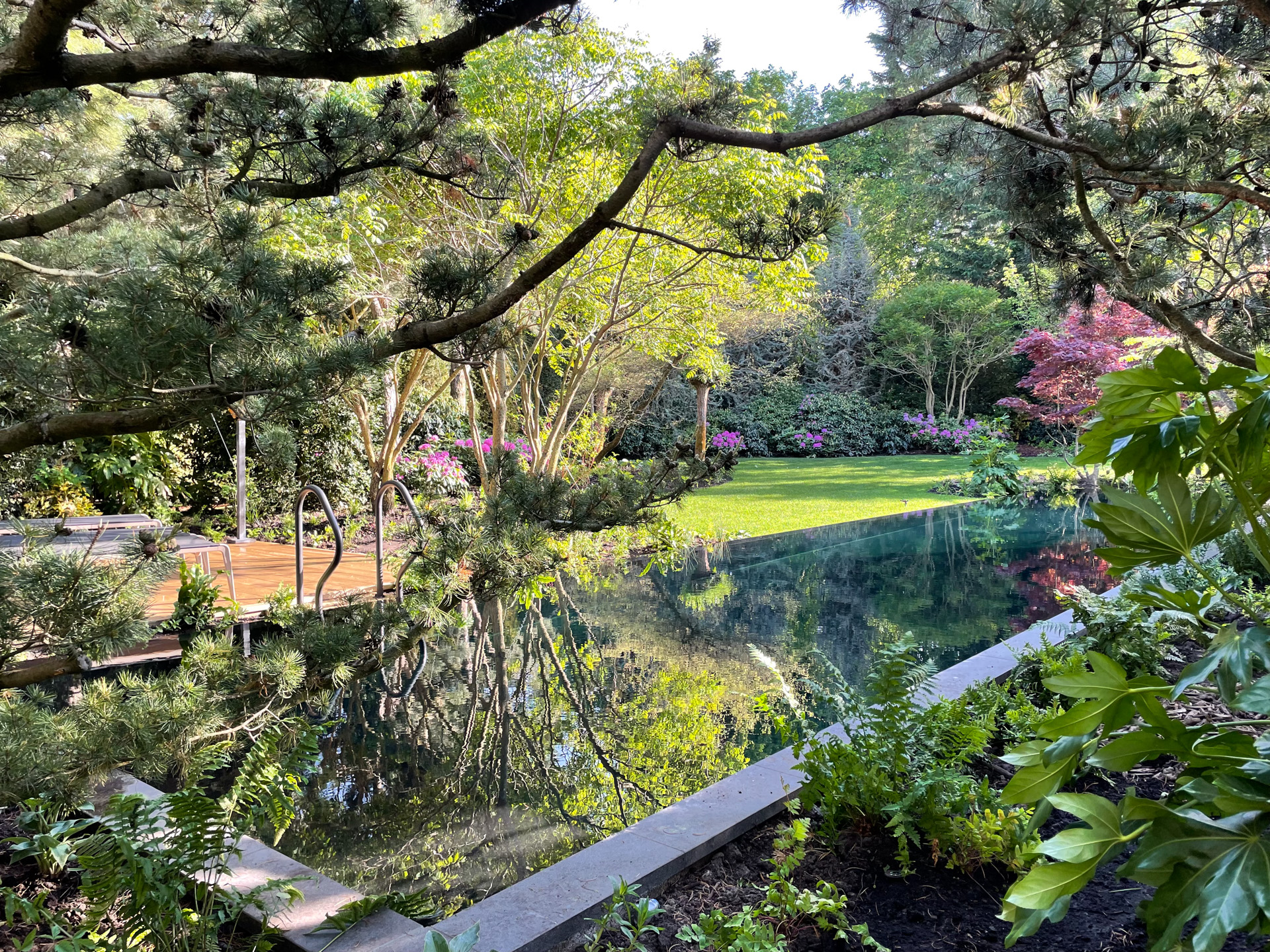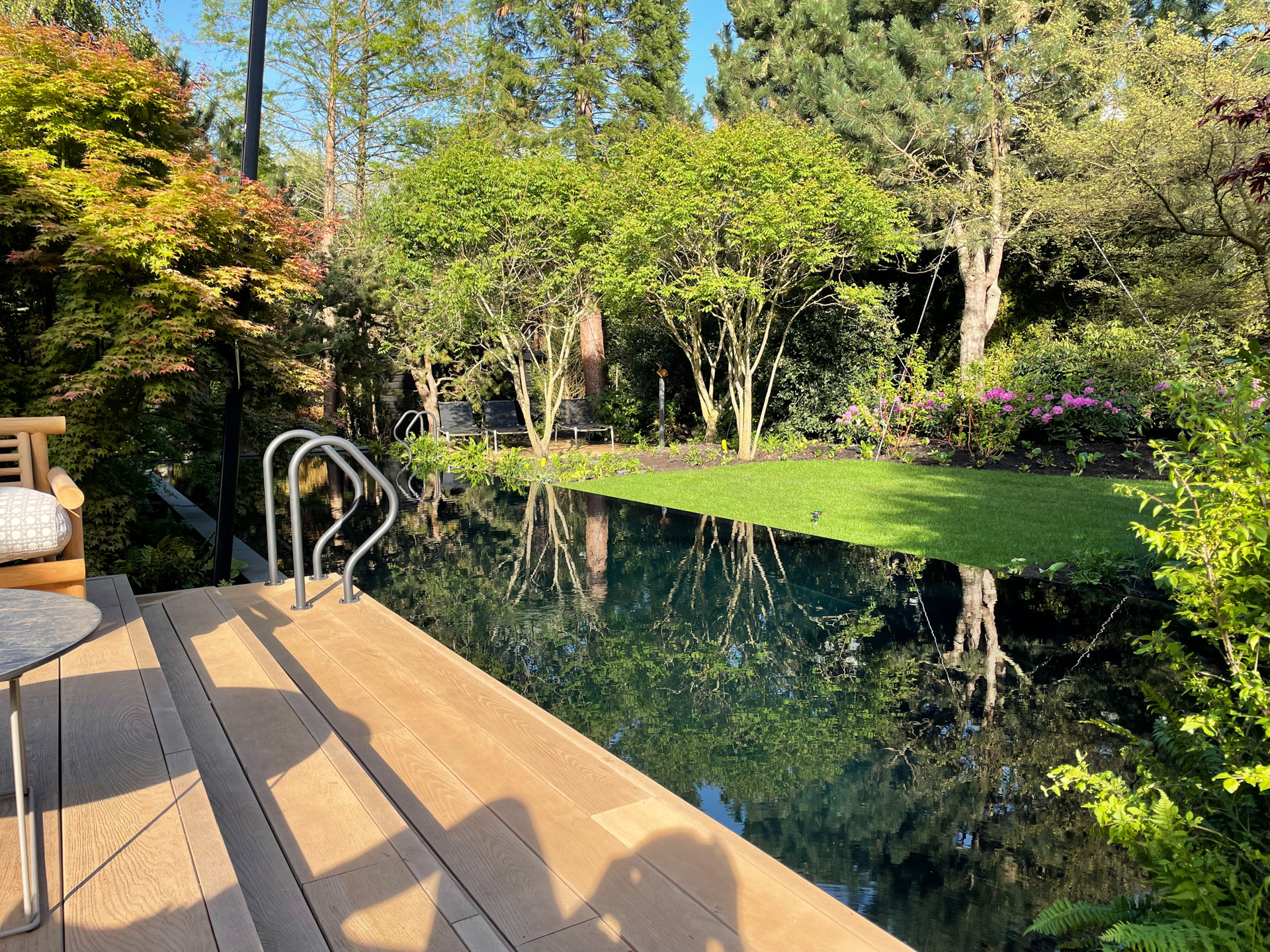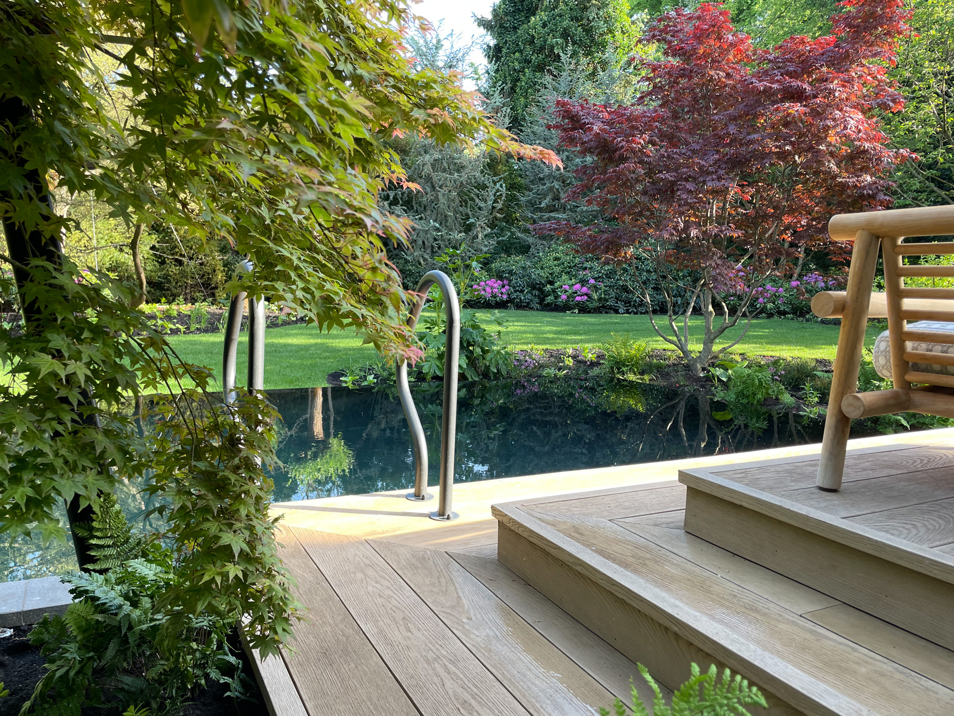 In deze weelderige tuin staat rust centraal. Het strakke zwembad vormt de kern van het ontwerp, naadloos omsloten door duurzame vlonders. Deze vlonders combineren de warme uitstraling van hout met modern onderhoudsgemak.
