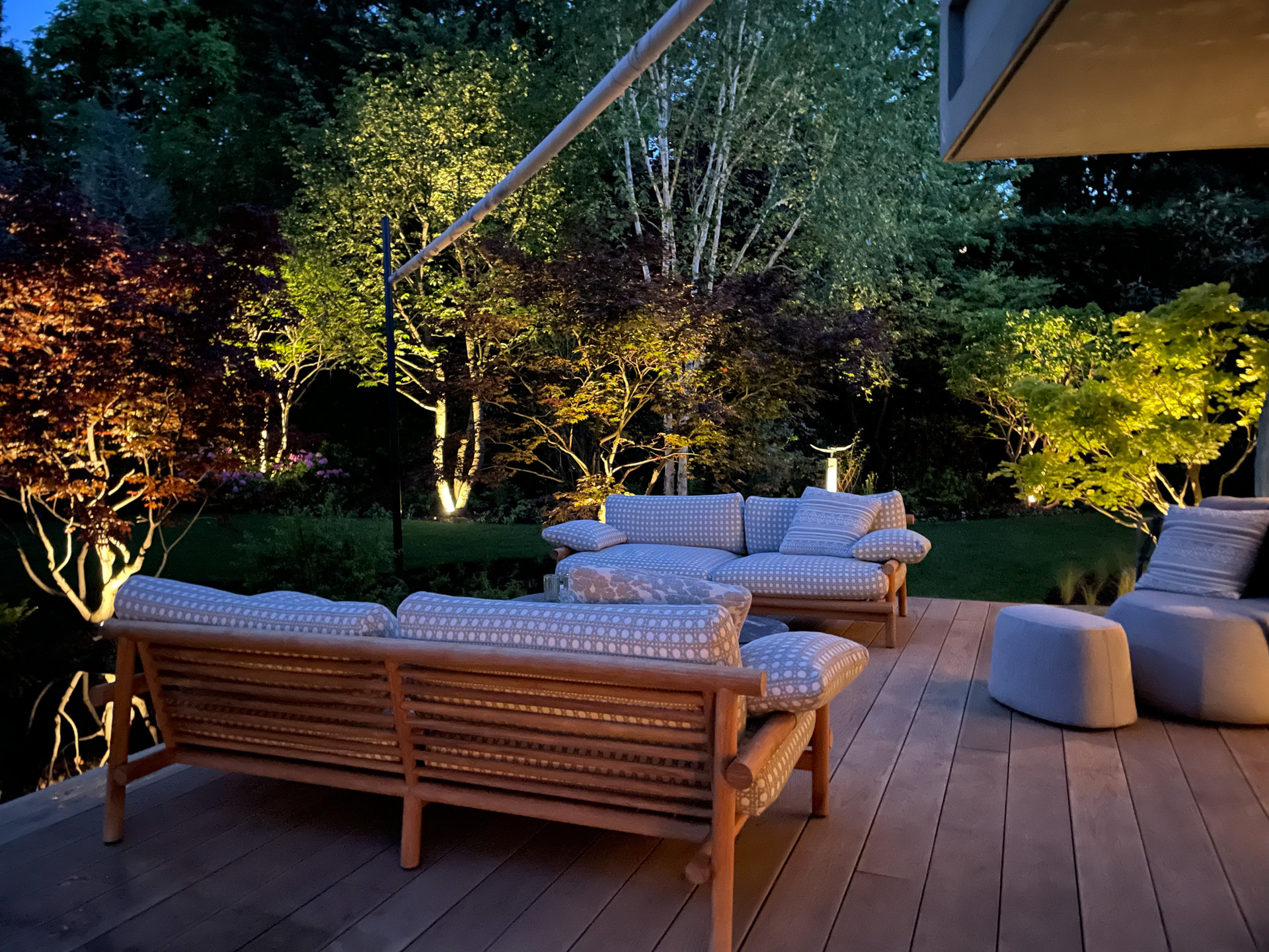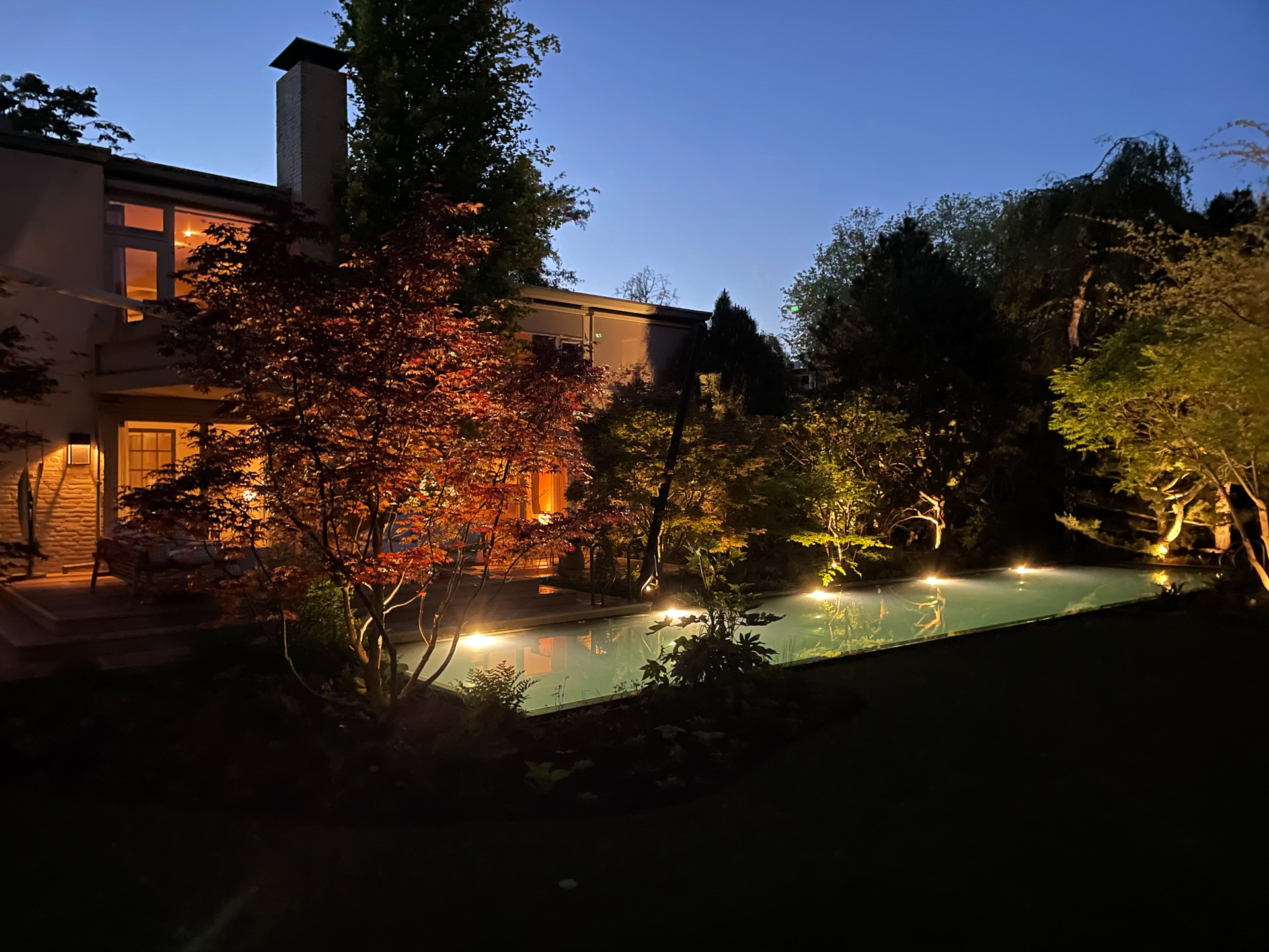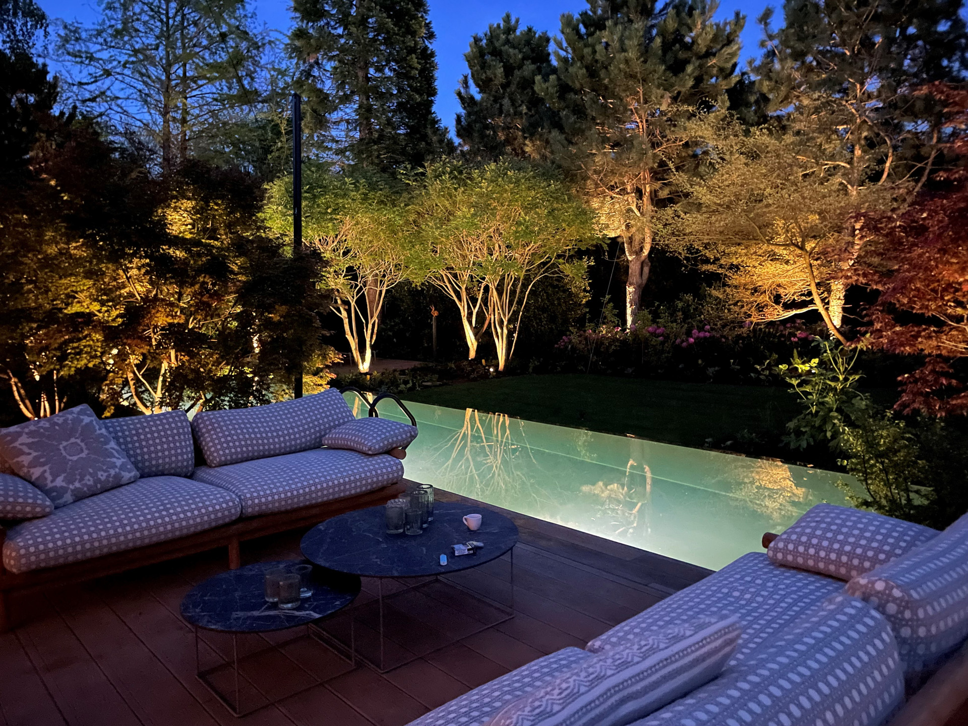 Zodra de avond valt, brengt de subtiele verlichting het lijnenspel en de natuurlijke texturen tot leven, wat zorgt voor een sfeervol schouwspel rondom het water.