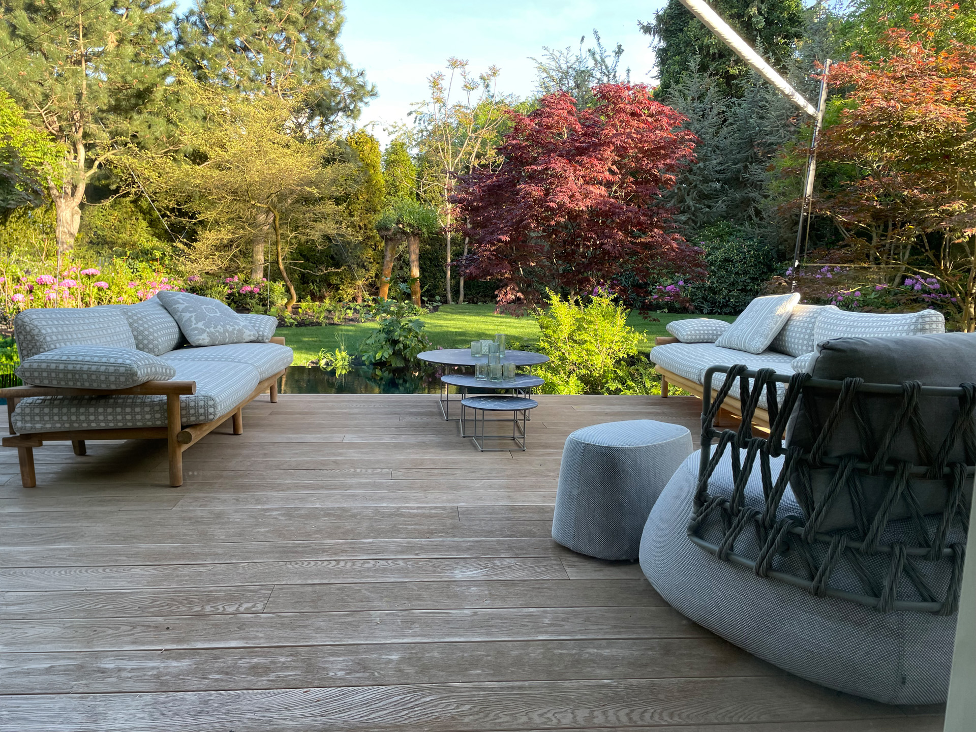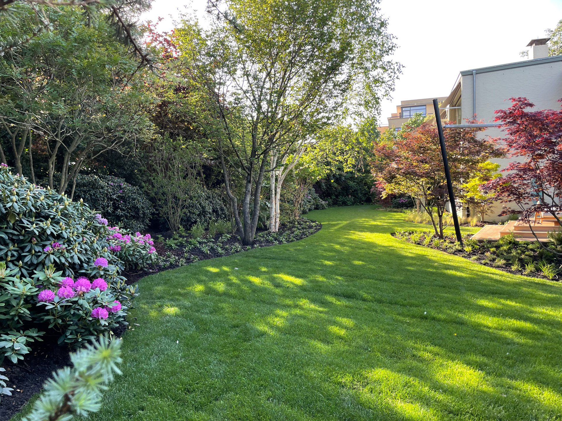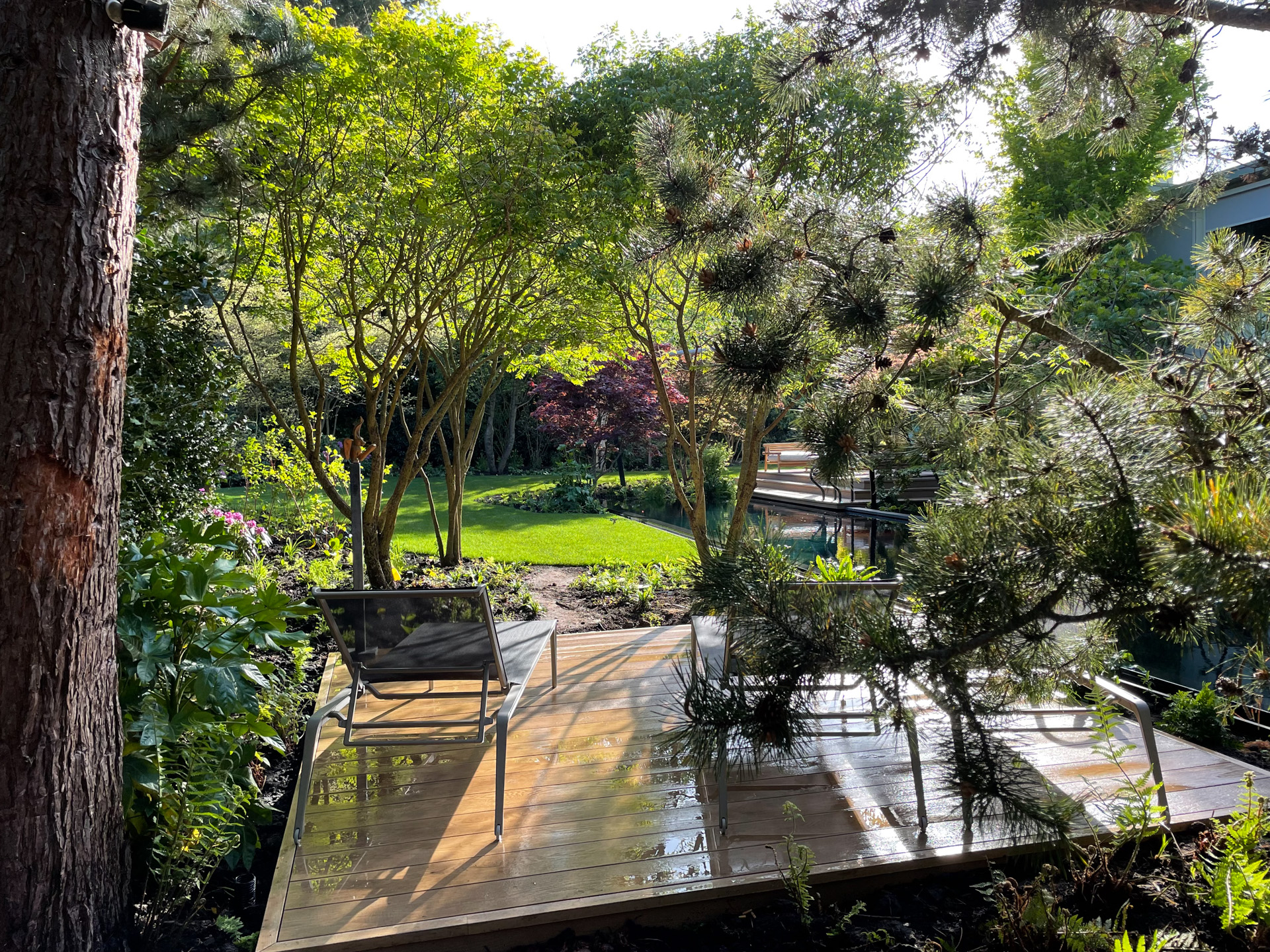 De tuin oogt direct volwassen door de strategische plaatsing van volgroeide meerstammige bomen. Zo ademt deze tuin al vanaf dag één een gevestigde, groene ambiance.