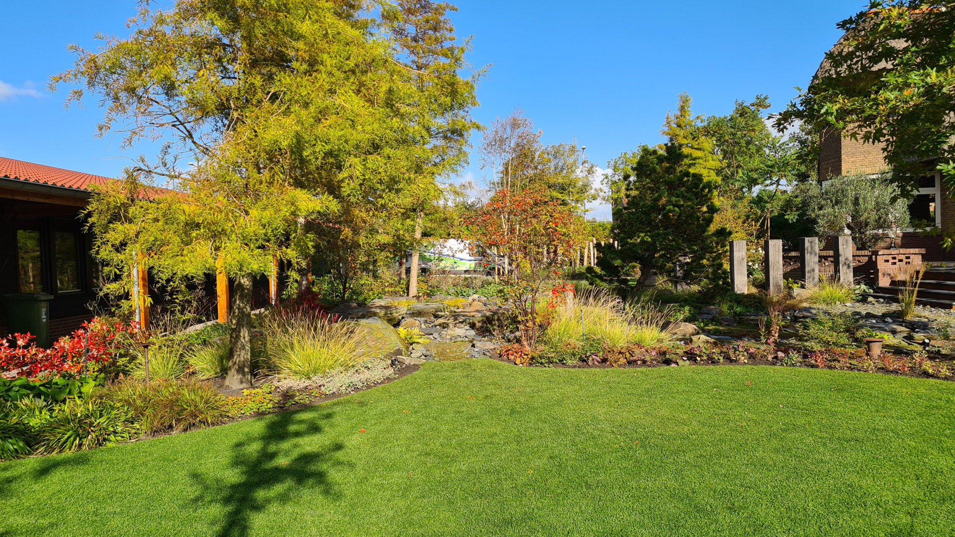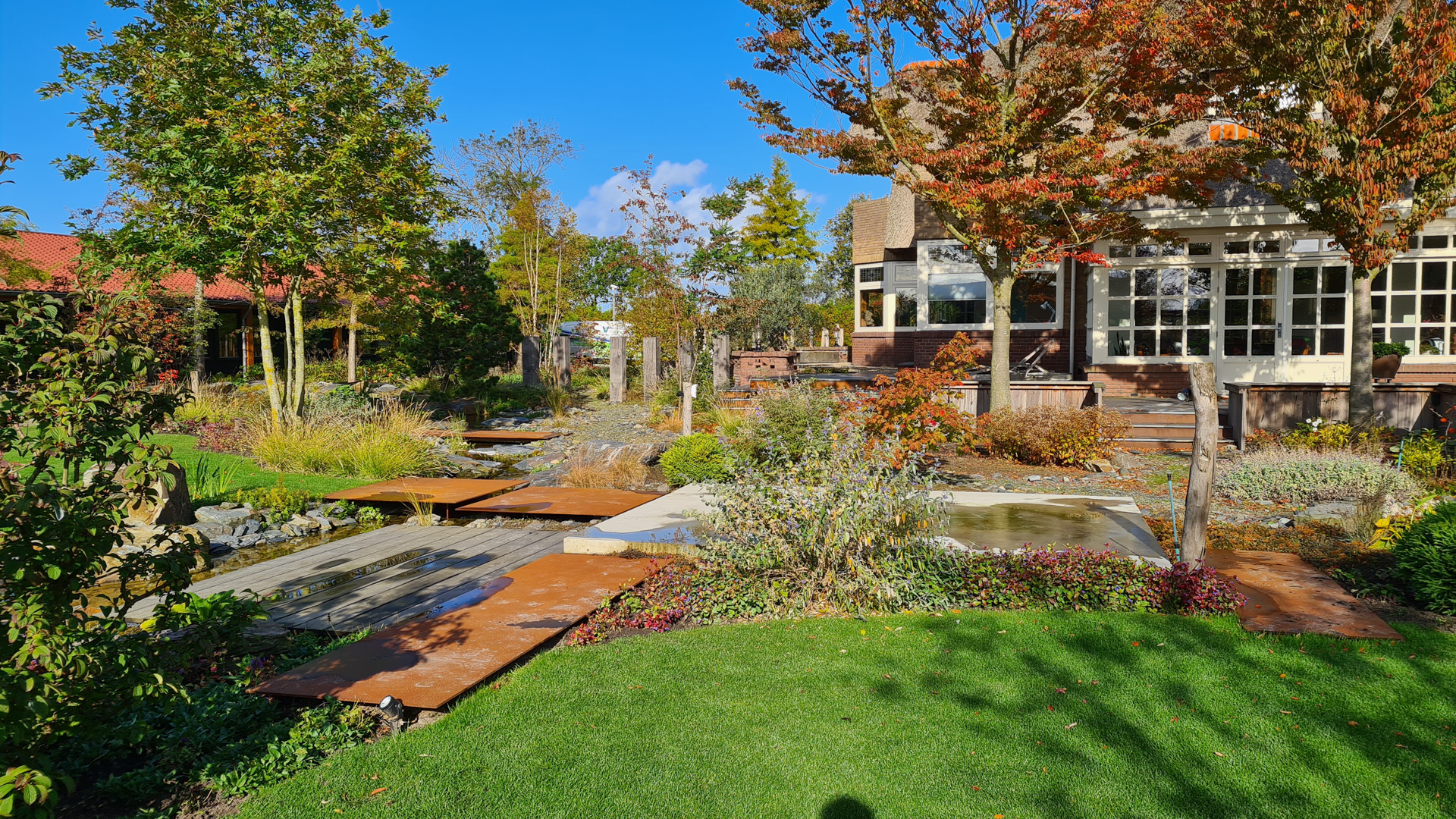 Robuuste, dikke eikenhouten palen fungeren als krachtige eyecatchers, terwijl bruggen en traptreden van Corten staal zorgen voor een modern, industrieel contrast. Om het comfort naar een ongekend niveau te tillen, is de tuin voorzien van een intelligent, nagenoeg onzichtbaar beregeningssysteem.