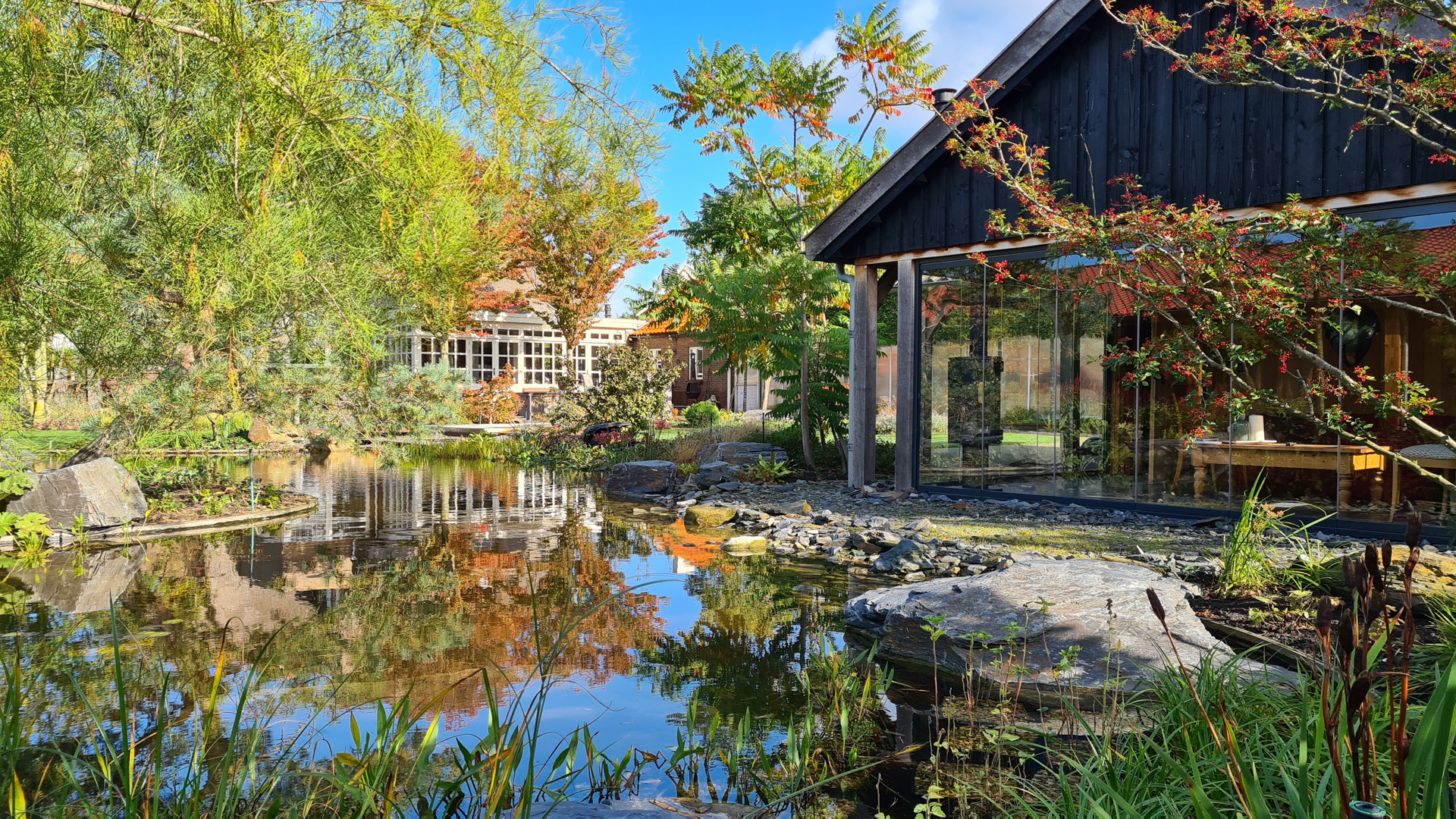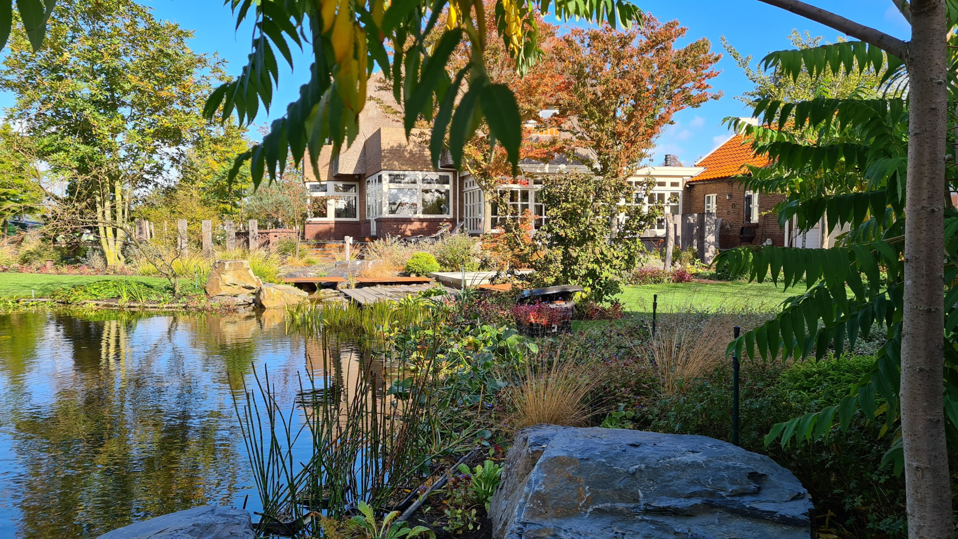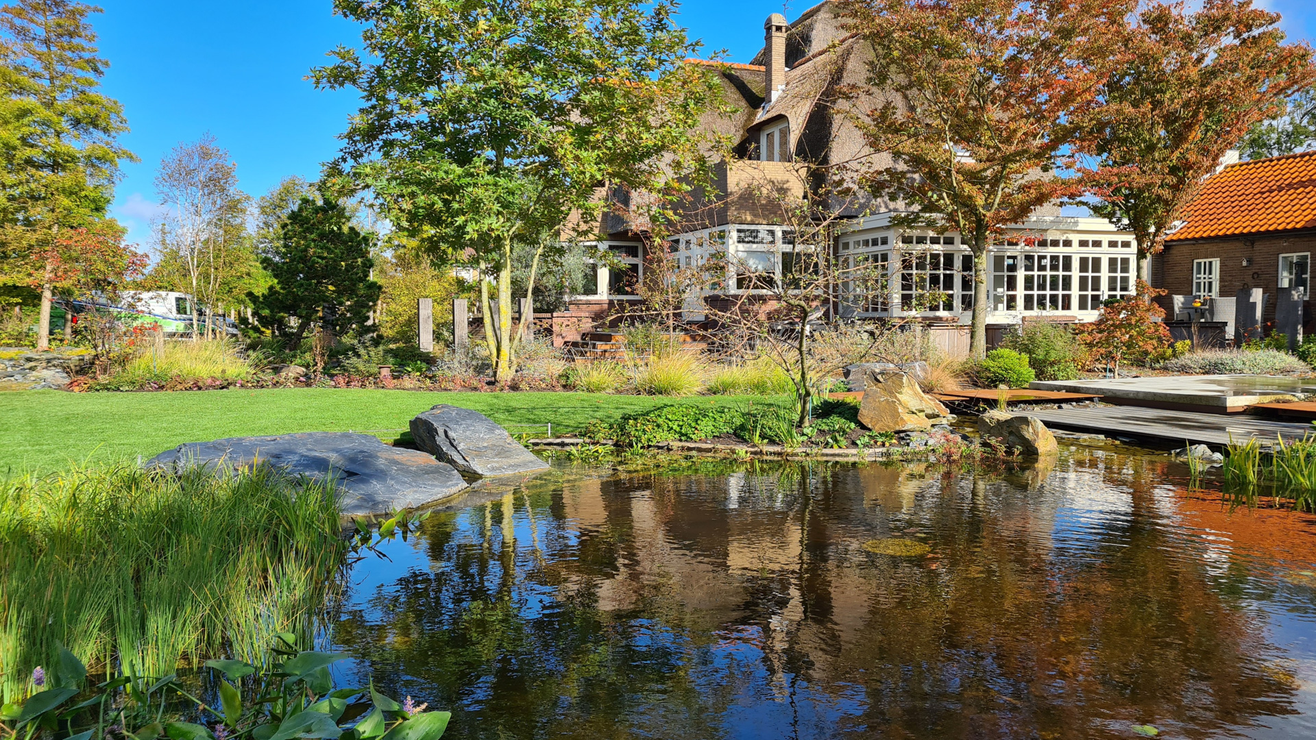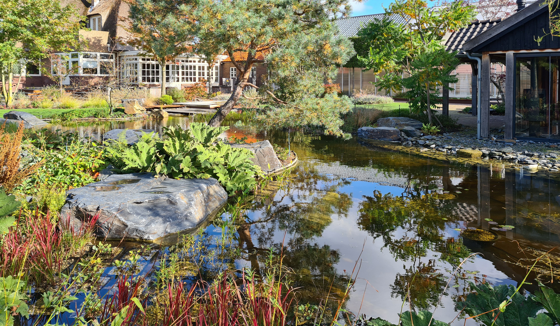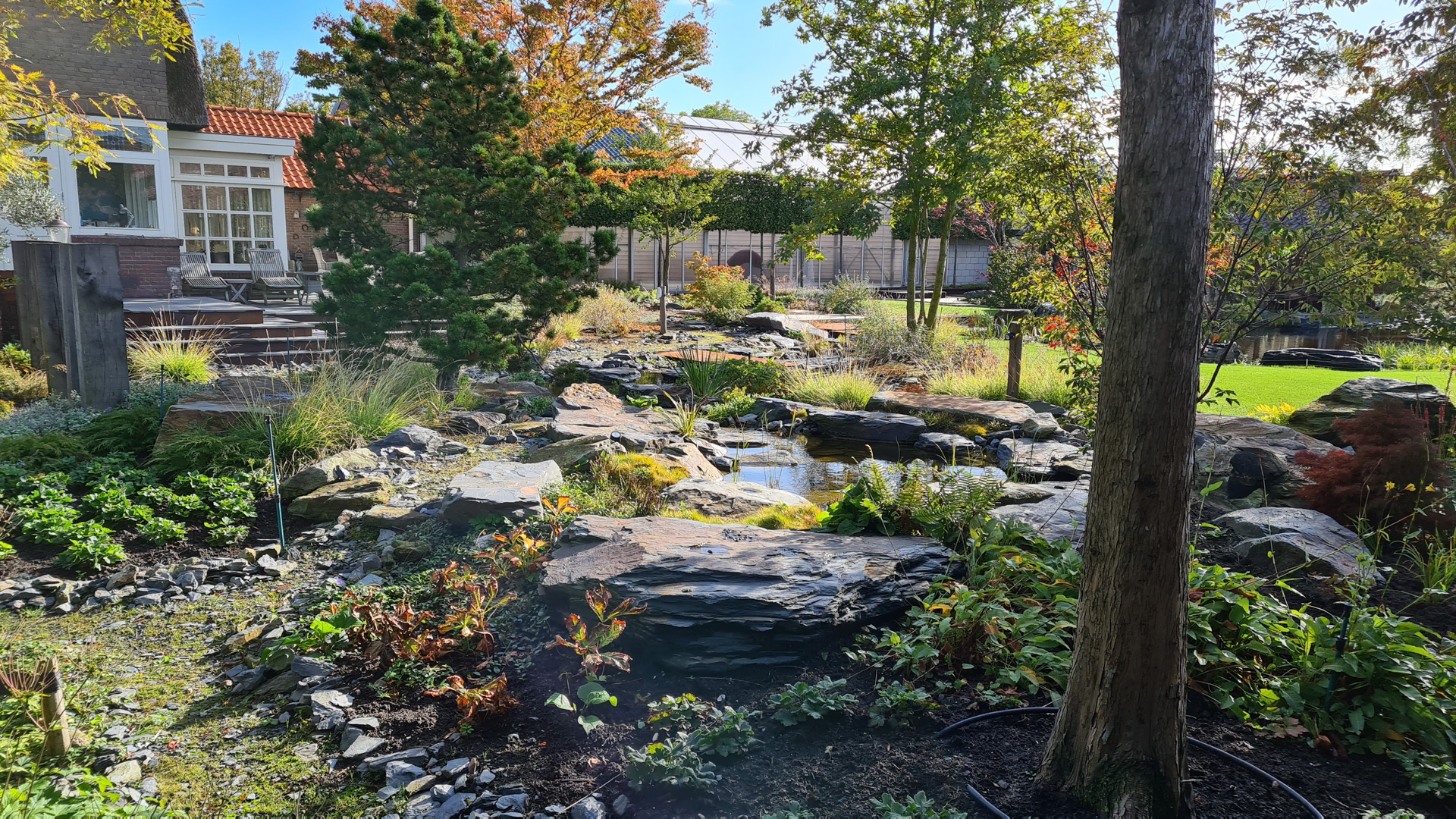 Deze exclusieve bostuin is een technisch hoogstandje waarin brute natuurlijke elementen en verfijnde architectuur samensmelten. Centraal staat de dynamiek van water; wij realiseerden zowel een complexe beekloop als een vijverpartij. Deze worden omzoomd door imposante natuurstenen keien die de tuin karakter geven.